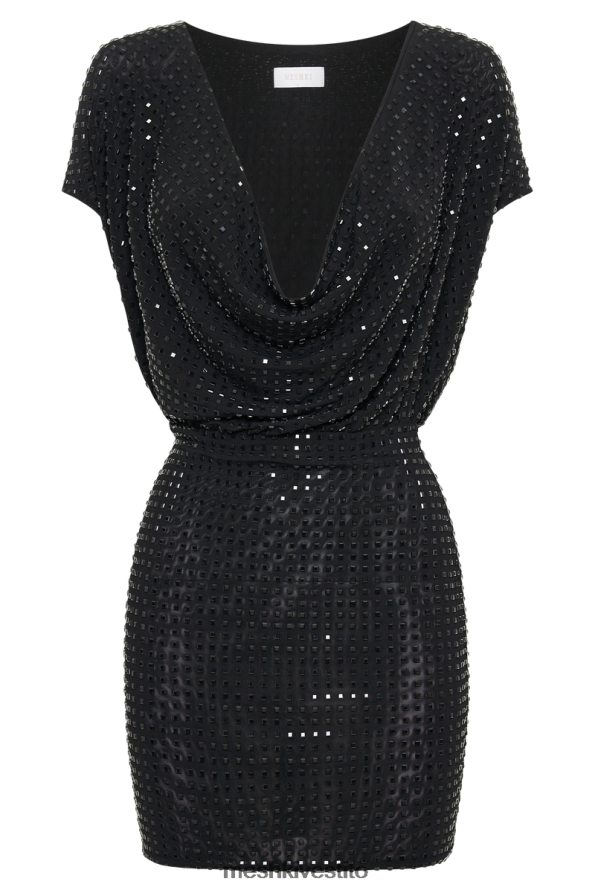 seona è un miniabito senza maniche con una scollatura profonda e un cappuccio fisso. realizzato in tessuto personalizzato tempestato di diamanti, la trama del vestito è accattivante e allo stesso tempo liscia come il burro. il materiale è traspirante e leggero, perfetto da indossare tutto il giorno. la scollatura anteriore è una scollatura a V profonda e profonda che cade liberamente appena sopra l'ombelico. lo scollo posteriore è un ampio scollo ad anello a strati grazie al cappuccio fisso. il taglio mini abito, la vita definita e il design senza maniche conferiscono a questo abito da cocktail un look urban street style.